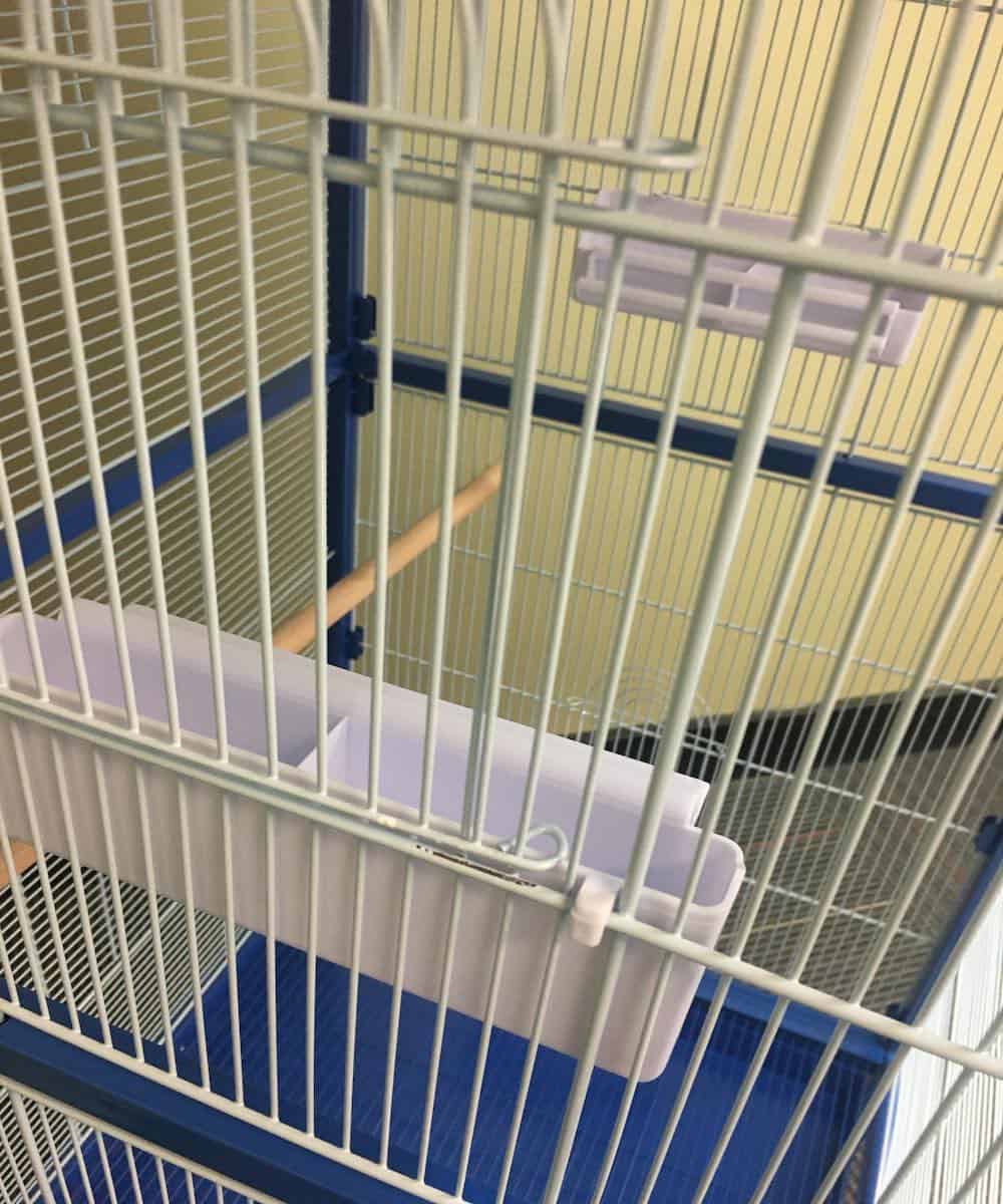 This premium bird cage is made of high quality steel. It has a stylish blue and white coated, non-toxic Hammerite finish. Its sturdy and durable industrial casters make it easy to move around.