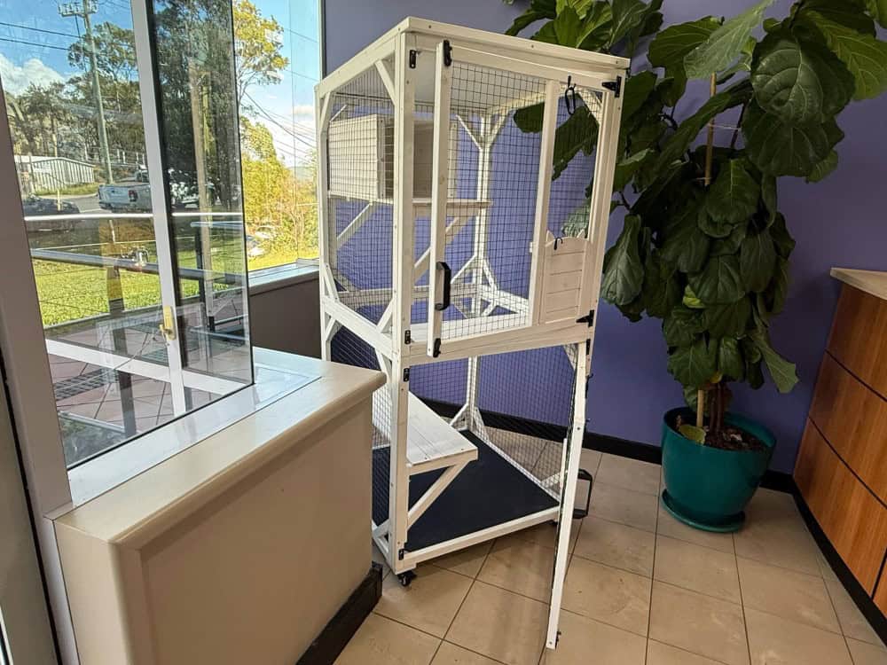 Equipped with sturdy castor wheels and brakes, the Tower is highly portable, while the 3 shelves and sheltered box area provide plenty of space for climbing and resting. Two large opening doors offer easy access, along with two small sliding doors that lock securely with hooks and clips.